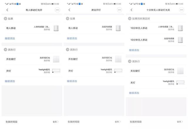 那就是洗手间内布置两个人体传感器,进门处一个,浴室内一个。设置为任意一个传感器有人移动就亮灯,而关灯条件则是两个传感器10分钟内都无人移动,这样就简单完美的解决了洗澡时厕所灯光自动关闭的尴尬情况了。