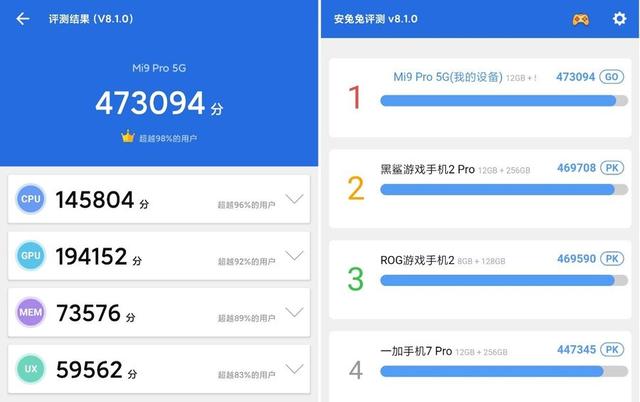 小米 9 Pro 5G跑出了47万的高分,名列安兔兔性能排行榜榜首,由此可见小米 9 Pro 5G在硬件性能方面的顶级实力。