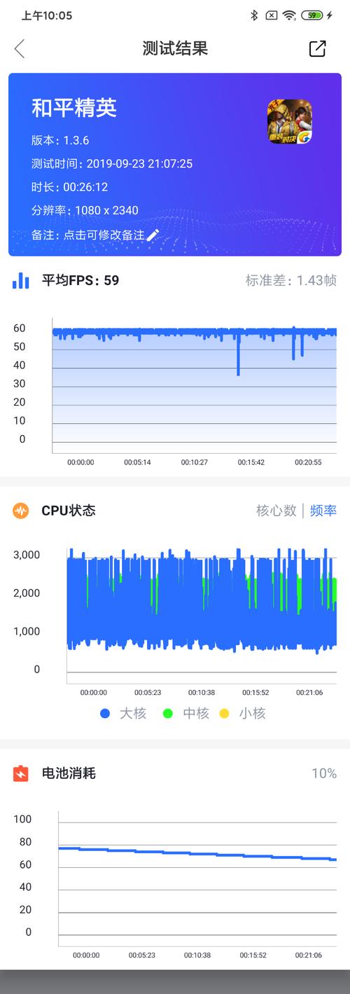 小米9 Pro 5G的平均帧数为59,全局标准差仅1.43帧,这已经是《和平精英》这个游戏能够达到的极限帧数了,整局游戏没有太多的帧数波动。电量消耗也在接受范围内,毕竟是最高画质,特效全开,如果是正常游戏时的画质,电量消耗会少的多。