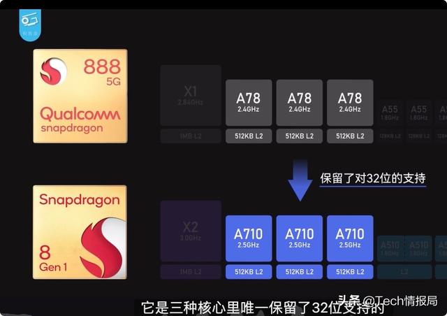 但是,新一代骁龙8处理器对32位应用的支持更不友好。在大、中、小三大CPU核心中,仅A710中核心唯一保留了对32位应用的支持,另外的X2大核和A510小核都只支持64位纯应用。