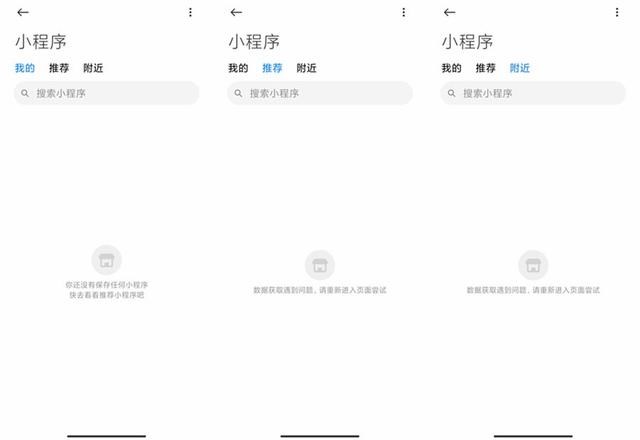目前,小米短信应用的小程序页面分三个标签页,分别是我的、推荐以及附近,和微信的小程序分类展示有点类似。只不过,在小米短信的小程序页面下,还没有内容,也就是还没有可用的小程序。所以,目前暂时来说小米短信的小程序还是一个占位符。