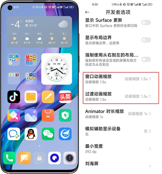 同时也有网友经过测试后表示,在开发者选项中将“窗口动画缩放”和“过渡动画缩放”2个动画效果的数值调成1.5,跟MIUI13更配,大家可以在升级后自行尝试一下!