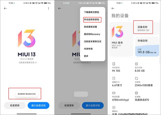 实际上,如果自己的手机型号是小米10S但没有收到MIUI13官方推送的话,也可以自己手动升级。自己手动下载MIUI 13的升级包后,连续点击自己的MIUI版本图标.开启系统更新扩展功能,使用手动选择版本,手动需要去下载小米10S 13.0.1.0系统包。