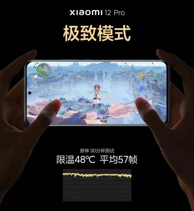12 Pro 王者荣耀半小时测试,平均帧率 119.9fps,温度43.5℃;原神半小时测试,限温 48℃,平均帧率 57fps,这个游戏表现可以说是相当可以了。