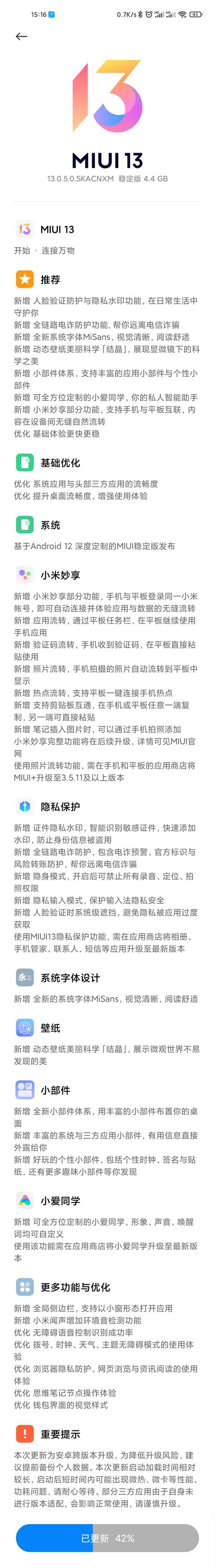 MIUI 13 新增小米妙享功能,可以实现小米平板与手机的无缝流转;新增隐私水印功能、全链路电诈防护功能。以下为完整的更新日志:
