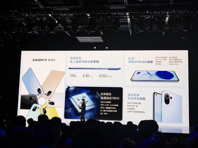 在介绍完安卓机皇和安卓之光后,小米11青春版也在本次发布会上亮相,这款新机主打超薄机身,号称史上最轻薄的小米手机,定位中端。新机采用6.55英寸AMOLED超薄柔性直屏,三边1.88mm等宽小窄边,2.75mm精致小下巴,屏幕还支持10亿色彩、DCI-P3 广色域、Dolby Vision等旗舰机才有的显示标准。