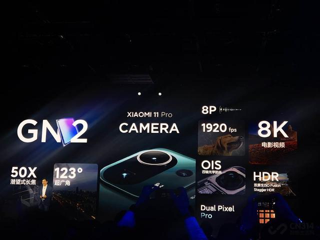 摄影是此次小米11 Pro升级的重点之一。由5000万像素(GN2光学防抖)主摄+1300万像素123°广角摄像头+800万像素(50倍潜望式长焦)摄像头组成。其中三星 GN2 传感器是小米和三星花了 2 亿人民币联合研发而来的,他的感光尺寸高达 1/1.12 英寸,支持 OIS 光学防抖、全像素全向 8 核对焦、HDR 双原生 ISO 。在夜枭算法的加持下,哪怕仅在0.02 Lux 照度极限暗光环境中也能拍出清晰、明亮的照片。在视频方面,小米11 Pro支持8K 24fps的视频录制,以及1920fps的慢动作录制。