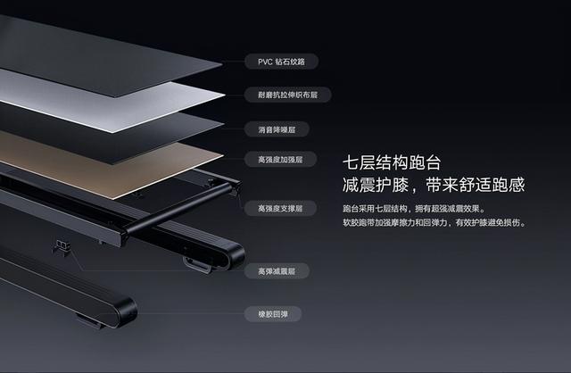 通过官网的介绍图可以看到,跑步机的跑台有专门经过消音设计,中间的消音层、底部的高弹减震层、再搭配上底部橡胶材质的支撑架,可以看出小米的设计师在消噪这部分做的还是挺用心的。