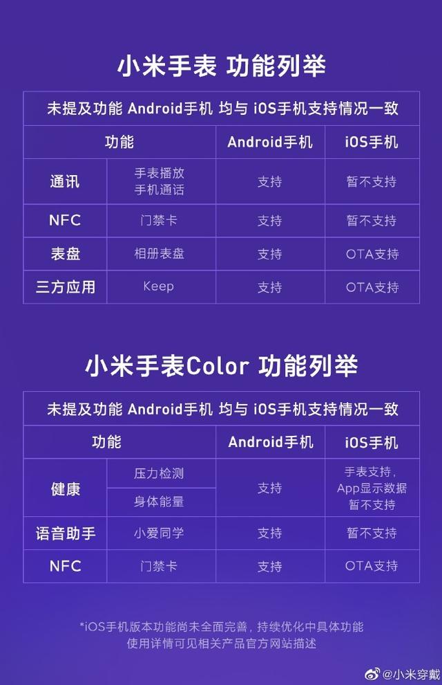 小米手表Color连接安卓手机后支持健康压力检测、身体能量,小爱同学和NFC门禁卡,连接iPhone手机,App暂不支持健康数据显示,暂不支持小爱同学,NFC门禁卡OTA推送支持。
