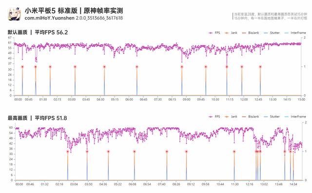 虽然个人测试肯定有不严谨的地方,但我还是尽量把体验量化给大家一个参考。上图是我测试半小时的帧率曲线。其中有15分钟默认画质(仅额外打开60帧选项),另15分钟是最高画质测试。然后这2组测试中都有一半时间在外跑地图摘果收集材料,另一半时间在打散怪。可以看我的这个测试条件下,默认画质平均帧率为56.2,最高画质平均帧率在51.8。打怪时候帧率会在40左右徘徊,这其中的大半的数据卡顿是我大地图切换场景和中途截图导致的波动,实际肉眼下并无太过明显的卡顿。总体来说这颗骁龙860处理器还是很够用,只是最近网上5pro的骁龙870盖过了它的锋芒。