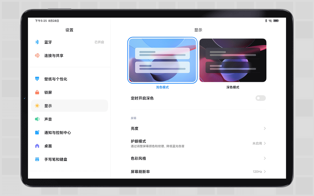 聊完功能亮点,也提点目前版本的UI细节优化建议,毕竟老本行也是个做UI的。设置显示里的屏幕刷新率在选中状态,比如这里选中120Hz,里面的蓝色矩形依旧直角,并未做圆角适配,而同为设置显示的上一级页面的浅色模式和深色模式的选项样式不同,建议统一视觉规范。还有就是锁屏和进入桌面时候的状态栏右侧电量信号处会有5px的位移,但状态栏左侧的时间却是没有位移。虽然说这两个小细节不影响实际体验,但建议开发有空时候修复下。