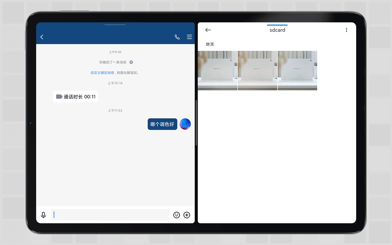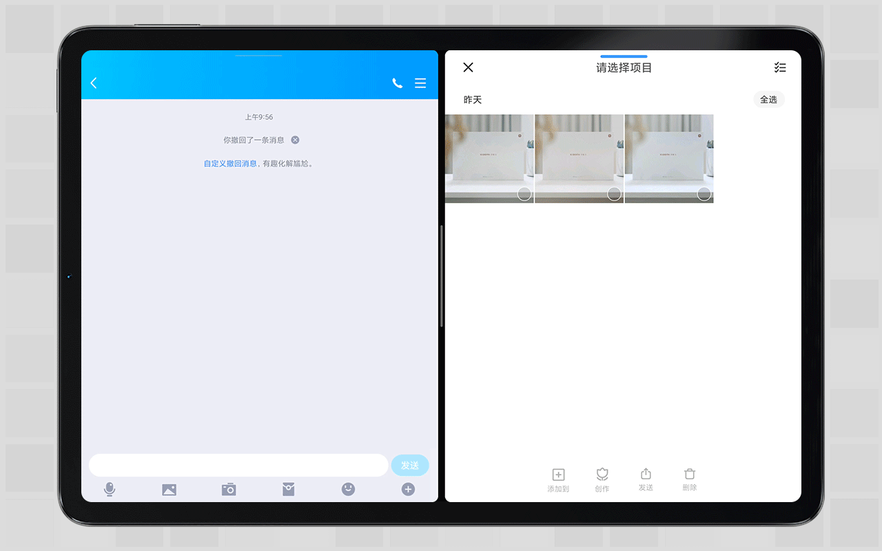 这功能不仅针对自家软件,比如QQ微信等非预装应用也一样支持从相册拖拽过分屏发送。滑动多选,拖拽多个文件到QQ聊天界面发送,极大的提升了沟通效率。这也是生产力的一种体现。