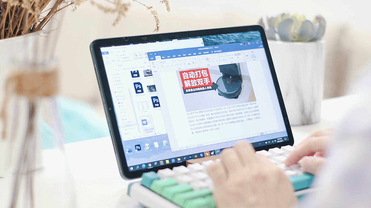 相信很多人都在想这块大屏幕上实现windows的操作体验,也不是完全不行。看上图,就是我用刚入手的一把61键的小机械键盘在windows桌面里的word打字。其实就是远程桌面的原理。你可以方便的在任何环境远程连接家里或公司的电脑操作。让小米平板5瞬间化身为小电脑。尤其是我前面说过,家里电脑屏幕和小米平板5采用一样的2.5k分辨率,所以它的远程桌面时的画面比例对我是最合适的。