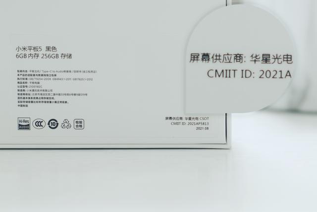包装背后有一个很细节的地方,就是在右小角印有屏幕供应商,我这台小米平板5标准版(6G+256G)的屏幕来自华星光电。推测后续可能还有别家屏幕供应商,但小米不玩抽奖,直接印出来,就说明它对不同屏幕素质的一致性有信心。