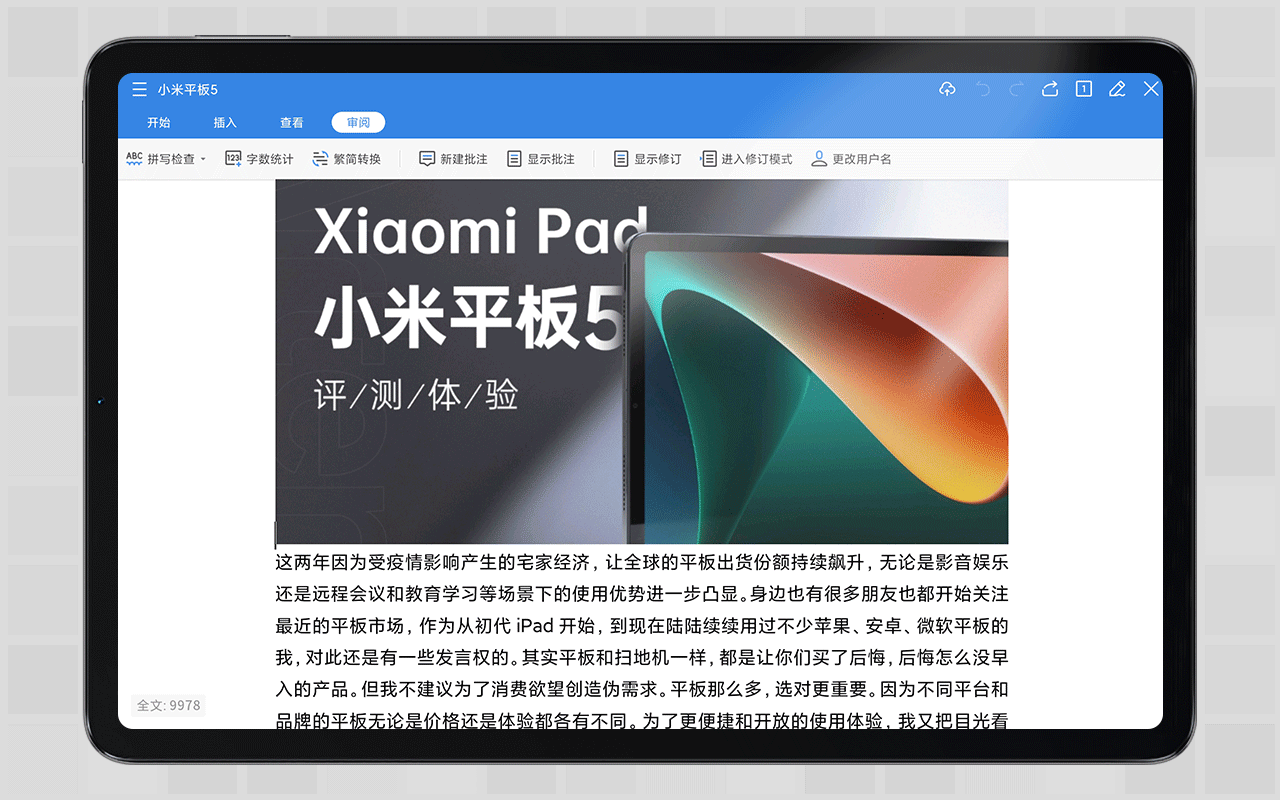 这个环节就是最值得你们收藏细看的部分了,我会介绍很多实用的软件来丰富这板子的使用体验。第一款非军军自家预装的WPS莫属,这款安卓版的WPS在大屏下不是简单都放大,符合大屏是布局,结构清晰合理。说windows版的ms office实力还是超过wps office相信没人否认,但在移动端,office软件必选wps。如果开启云同步,可以方便的调取单位保存好的word或者excel文件,在家也能随时打开调阅修改。本篇文章全程在小米平板5上预装的WPS搭配蓝牙键盘码字出来。这也是一种生产力的体现。
