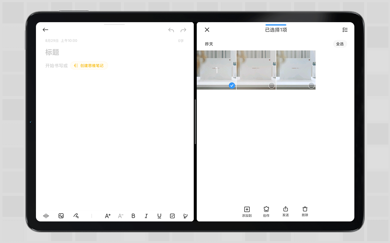除此之外,为了让使用效率提升,MIUI For Pad还打通了一些应用的跨软件拖拽,比如笔记和相册分屏时候,可以直接从右侧相册选中的图片长按拖拽到左侧的笔记之中。