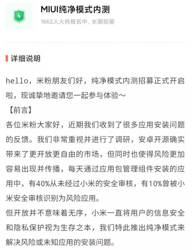 最后:由于才刚刚宣布开启纯净模式的内测,所以目前还不清楚小米是如何解决的,但从官方的介绍来看,应该是开启纯净模式后,除了可以在小米应用商店下载安装App,其他来源的App都会被禁止安装。当然了,安卓的开放还有,就是在用户需要安装其他来源的App时,可以关闭该模式后安装。