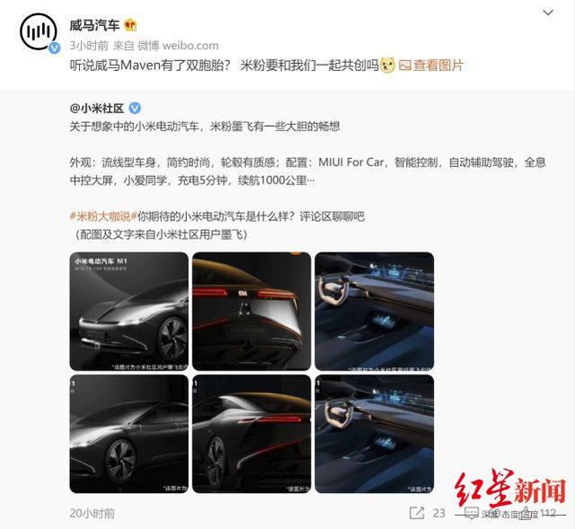 9月8日,威马汽车官方微博转发了小米社区这条微博,称“听说威马Maven有了双胞胎?米粉要和我们一起共创吗”,并附上了威马Maven的设计长图。