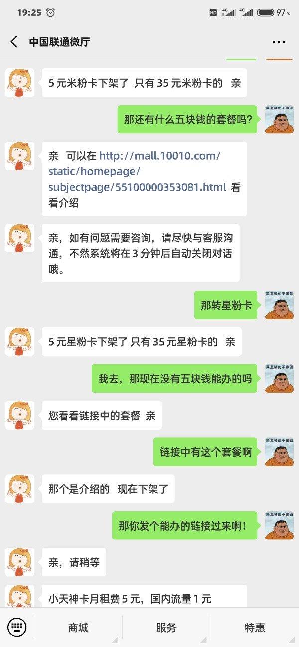 根据笔者询问中国联通的自动客服发现,目前中国联通会推荐新畅爽5元卡。而5元米粉卡已经在2019年5月5日停售,已无法办理和转入。星粉卡5元档(自由版和预存版)目前已停售。