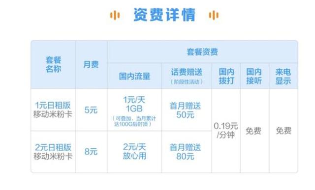 2018年9月27日,中国移动和小米联合推出米粉卡,具体分为两个套餐版本,其中 1 元日租版月租费 5 元,流量价格为 1 元 1GB 每天;2 元日租版月租费 8 元,流量价格为 2 元不限量每天。