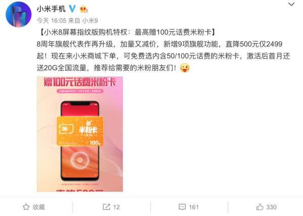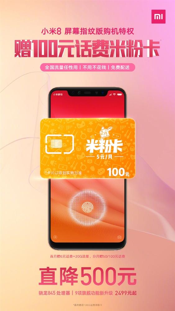 【手机中国新闻】随着小米9的发布,曾经的旗舰小米8也正式降价销售,原本2999元的屏幕指纹版现如今直降500元,到手价2499元。除了降价外,小米又为用户带来了新福利,小米8屏幕指纹版购机特权,最高赠100元话费米粉卡。