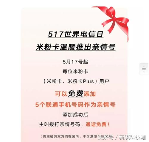 除了米粉卡将省内流量升级为全国流量之外,米粉卡还新增了亲情号,自5月17日起,每位米粉卡用户可以免费添加5个联通手机号码作为亲情号,添加成功后,主叫拨打亲情号码通话免费。