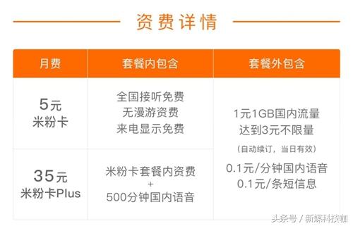 5元米粉卡:全国接听免费、无漫游资费、来电显示免费,35元米粉卡Plus:包含米粉卡套餐+500分钟通话。