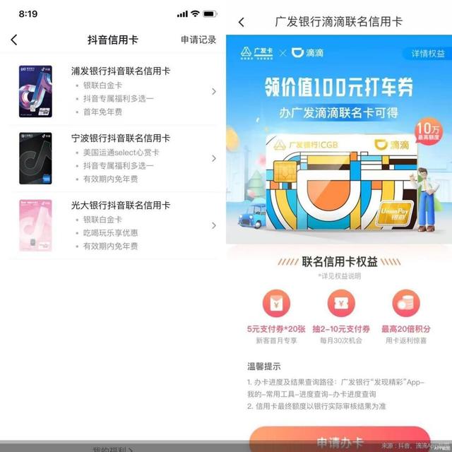 抖音、滴滴与不同银行的联名信用卡