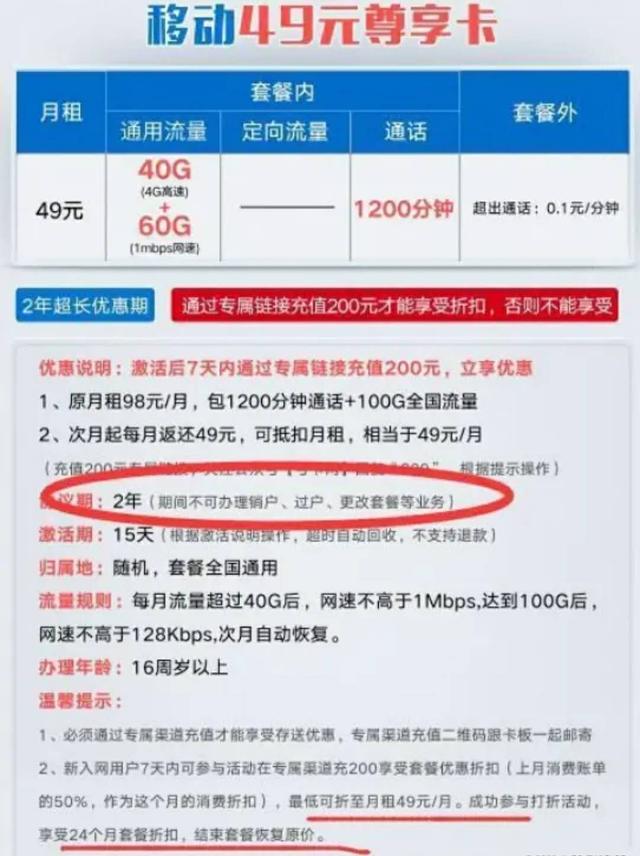 那么事实真的如此吗?答案当然不是,套路还是有的。这款套餐只限于16周岁以上的用户使用,并且只有24个月的优惠期,优惠期结束后就会恢复98元的原月费。换句话说,这个套餐并不是永久性的,移动只是优惠两年的时间,如果你两年后不舍得换号那就必须选择支付高昂的月租费用。另外,移动49元套餐仅限16周岁以上用户办理,并且两年内不允许更改套餐、过户和销户,这明显就有点“霸王条款”的意思。
