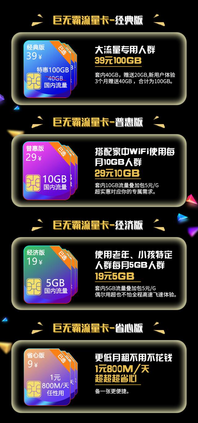 大流量用户的福音,全民优打特别适时的推出了一款巨无霸流量卡,39元的月租,竟然有100GB的不限速流量,按照工信部之前公布的流量均价8.5元/G的数据,100G需要的资费高达850元/月。全民优打连零头都不到,却提供了100G不限速流量。实在是太合适了,当然除了39元的月租,还有其他月租费用更低的套餐。29元10GB的套餐,19元5GB的套餐,还有月租只有9元的超低流量套餐,1天800MB的套餐只需要1元/天。更低月租对于用户来说就是更多选择。