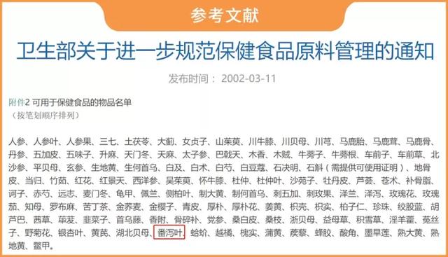 在《卫生部关于进一步规范保健食品原料管理的通知》中,番泻叶可以用于保健食品,且必须标注出来。