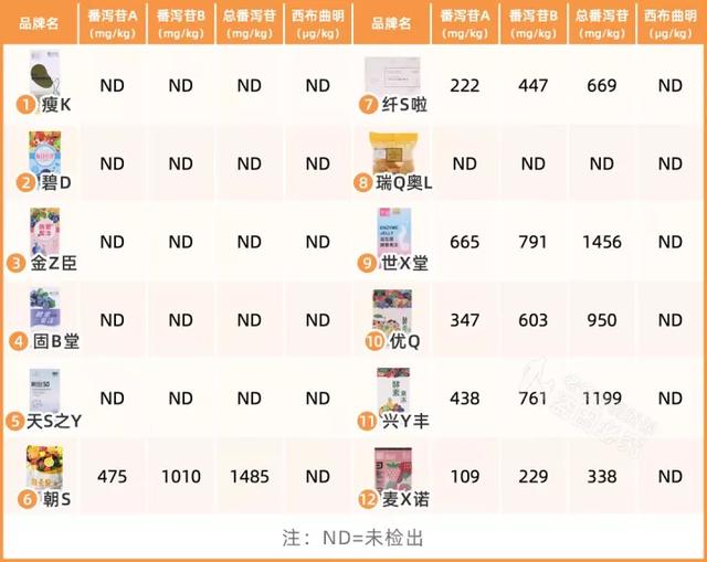 6 号、7 号、9 号、10 号、11 号和 12 号共6 款样品中检出番泻苷,12 款样品均未检出西布曲明。
