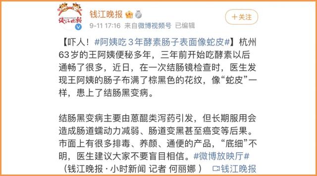 上周末就有一位杭州阿姨上了热搜,她吃了3年酵素产品后患上了结肠黑便病,肠子上布满了棕黑色的纹路,表面形似蛇皮。