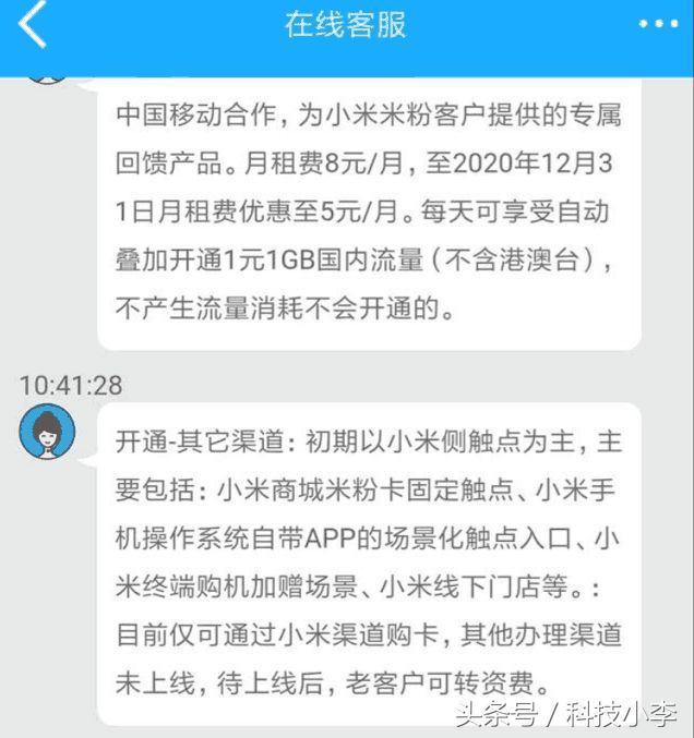 值得一提的是通过联系相应客服,1元日租版的移动米粉卡实际月租同样为8元,而在2020年12月31日之前,1元日租版的移动米粉卡月租会优惠至5元/月,此外在开通渠道方面,由于移动米粉卡在开放初期,目前仅可通过小米渠道购卡,其他办理渠道还未上线,而待上线后,老客户也可转此套餐。