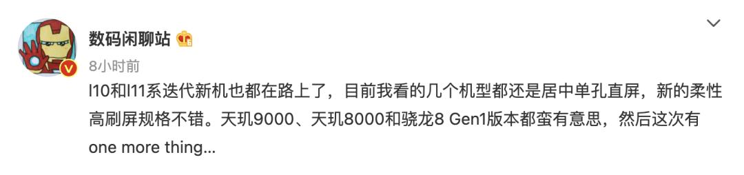 而就在今天,爆料博主@数码闲聊站 就带来了关于该系列的最新消息,他透露:“l10和l11系迭代新机也都在路上了,目前我看的几个机型都还是居中单孔直屏,新的柔性高刷屏规格不错。天玑9000、天玑8000和骁龙8 Gen1版本都蛮有意思,然后这次有one more thing… ”