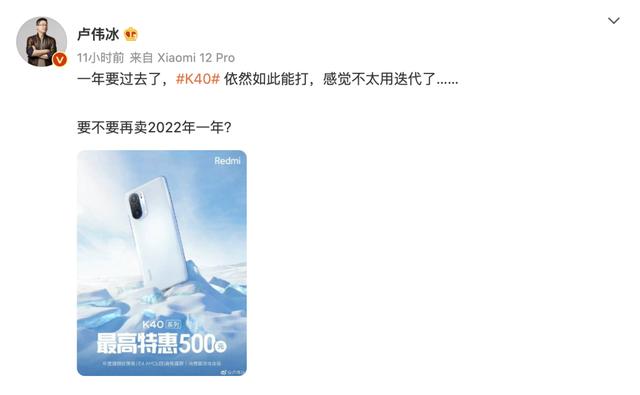 卢伟冰还表示:“一年要过去了,K40依然如此能打,感觉不太用迭代了,要不要再卖2022年一年?”