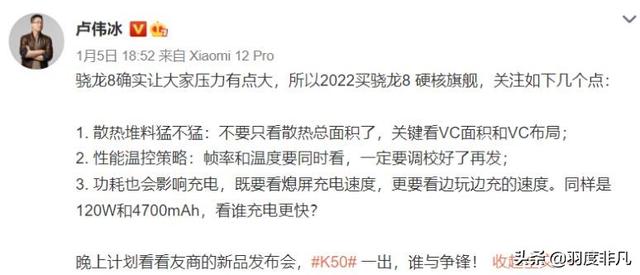 为了增强游戏体验,Redmi K50电竞版还会配备X轴线性马达、小米与JBL联合调校的立体双扬声器,核心采用VC液冷散热方案,Redmi品牌负责人——卢伟冰透露Redmi K50系列将在充电效率方面深度调校,不仅在标准充电模式下保证充电效率,同时边玩边充的状态下也能保证充电效率,而功耗控制和散热能力就是关键了。