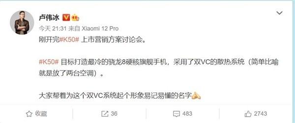 【手机中国新闻】随着2022年新一年大幕的开启,各家品牌上半年的旗舰手机产品纷纷官宣,1月5日,Redmi品牌正式官宣K50系列将在2月份和我们如约而至。据悉,K50首款产品的代号为DreamPhone,该机将挑战行业最冷骁龙8移动平台;支持双VC双重液冷散热;同时还将支持120W神仙秒充Pro,搭配4700mAh电池,17分钟即可充满。而针对“挑战行业最冷骁龙8移动平台”,1月8日晚,Redmi品牌负责人卢伟冰发微博称:“(Redmi K50系列)采用了双VC的散热系统,简单比喻就是放了两台空调(进手机)。”这让不少Redmi的粉丝抱以期待。