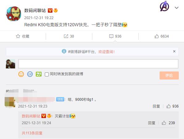 昨晚,知名爆料博主@数码闲聊站 也带来了关于该机的最新信息,他透露Redmi K50电竞版将搭载120W快充,这也是整个Redmi品牌第一次推出120W快充的游戏手机,能极大的保证游戏时间。