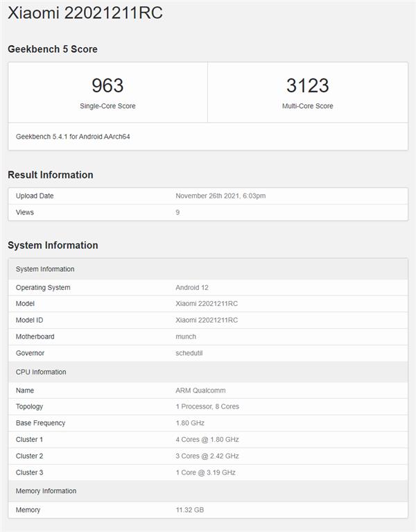 巧合的是1月9日有人发现Redmi K50标准版出现在Geekbench 5数据库中,根据曝光的信息Redmi K50还是基于高通骁龙870处理器打造,它的单核心得分为963,多核得分为3123。懂行的人都知道这个跑分肯定是基于工程机的,正式的商用量产机得分还会高一些。信息显示相对于上一代Redmi K50升级到了67W快充,肯定是支持120Hz刷新率的。