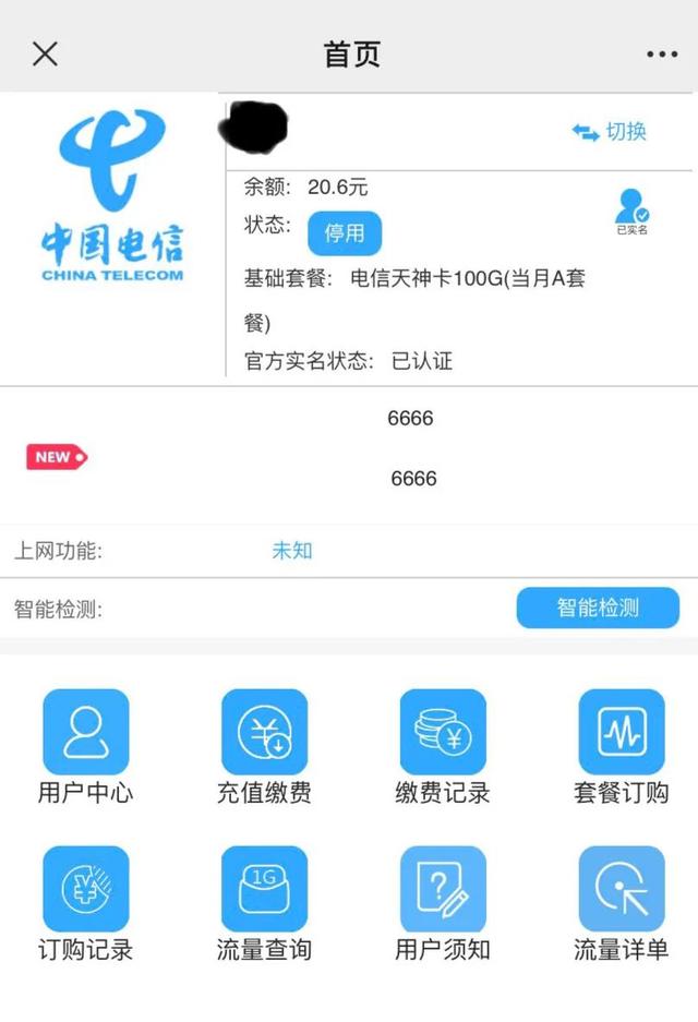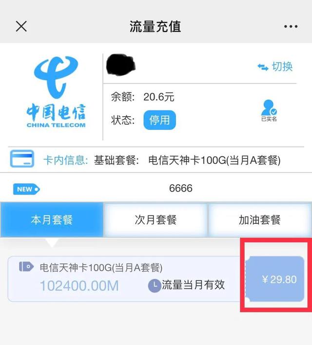 因为我这个月没充值,所以提示停用。它充值的话只能50元、100元、200元这种,我目前还剩20.6元。