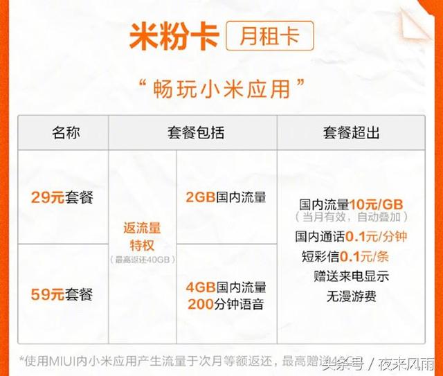 这张月租卡是名副其实的优惠套餐,国内流量2GB 29元,4GB仅需59元,同时官方还推出更加亲民的MIUI内小米应用流量次月返的米粉特权,让米粉玩转MIUI应用不花钱