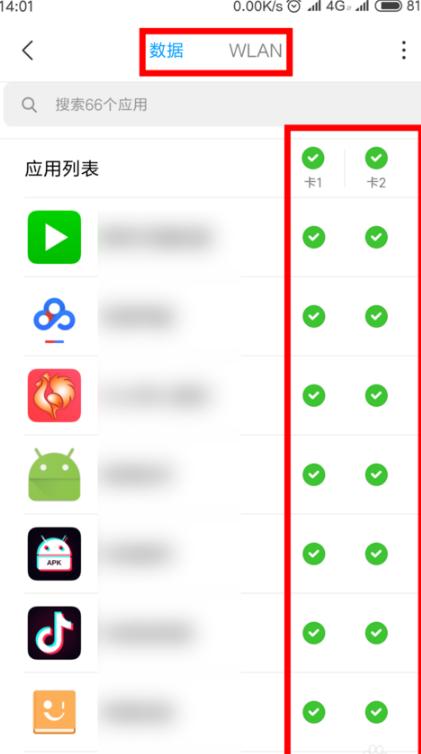 确保【数据和WLAN】这两个选项里边,应用的右边允许访问网络是开启的。