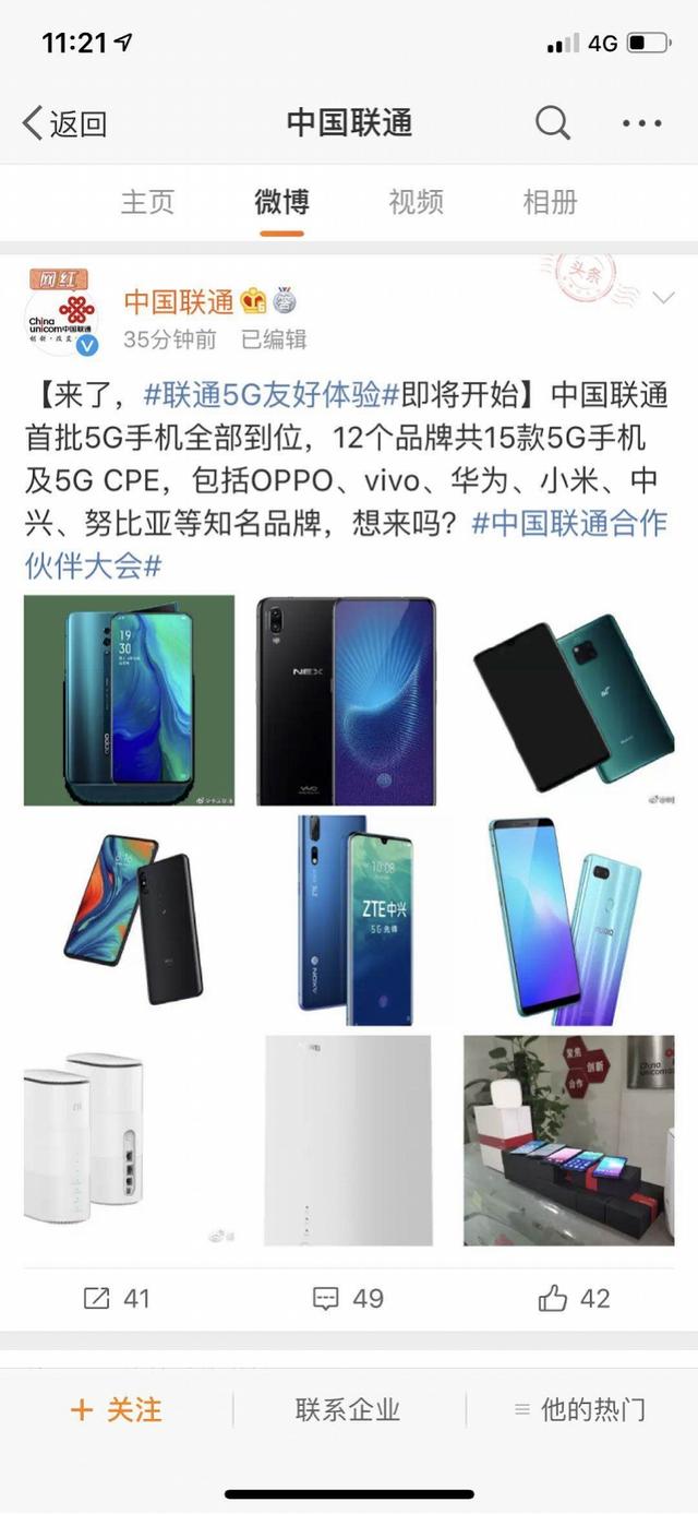4月17日,中国联通在官方微博披露,用于5G友好体验的首批合作5G手机全部到位,共有12个品牌共15款5G手机及5G CPE(无线终端接入设备),包括oppo、vivo、华为、小米、中兴、努比亚等知名品牌。