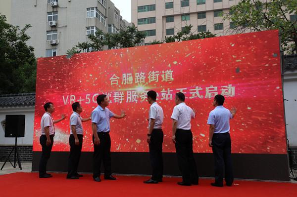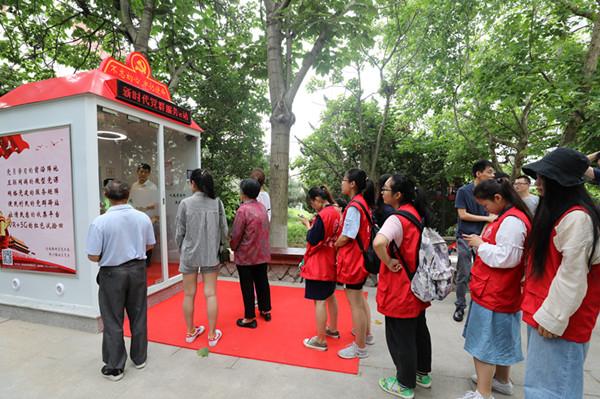 在活动现场,首次亮相的"5G+VR"数字化党群服 务e站成为社区居民争相体验的焦点。这间仅有两三平米大小的玻璃房内配置有一个触摸大屏和一只VR眼镜,顶部配有VR头盔定位器、烟感温感、监控、灯和风扇,党员群众只需点击门外按钮即可进入,并通过微信扫描二维码登陆使用系统。据了解,青岛联通提前在附近部署开通了5G基站,通过CPE设备为驿站内部搭建起5G网络,同时借助系统远程监控的方式进行管控维护。