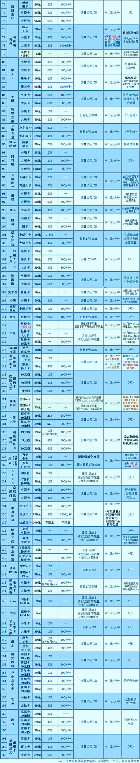 众所周知,自从联通、电信陆续与互联网企业合作,推出了腾讯王卡、蚂蚁宝卡、京东强卡、阿里鱼卡、百度圣卡、等一系列高性价比的互联网套餐(电话卡/流量卡),现在随着网络的发展,又新增了哪些互联网套餐呢?小编精心整理了100余种互联网套餐(电话卡/流量卡),总有一款适合你,明细如下:...