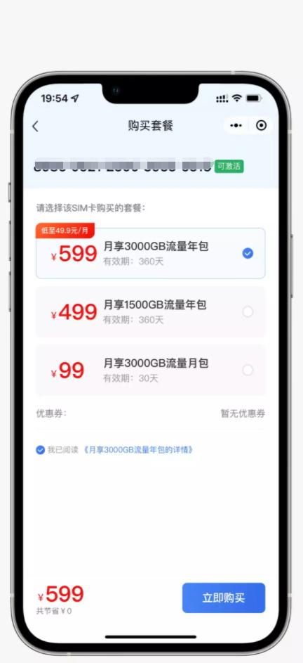 正式的流量套餐就是这三种了,性价比最高的当然是599元的年套餐了,月享3000G,平均每月只需49.9元,比起宽带来说是便宜很多的。