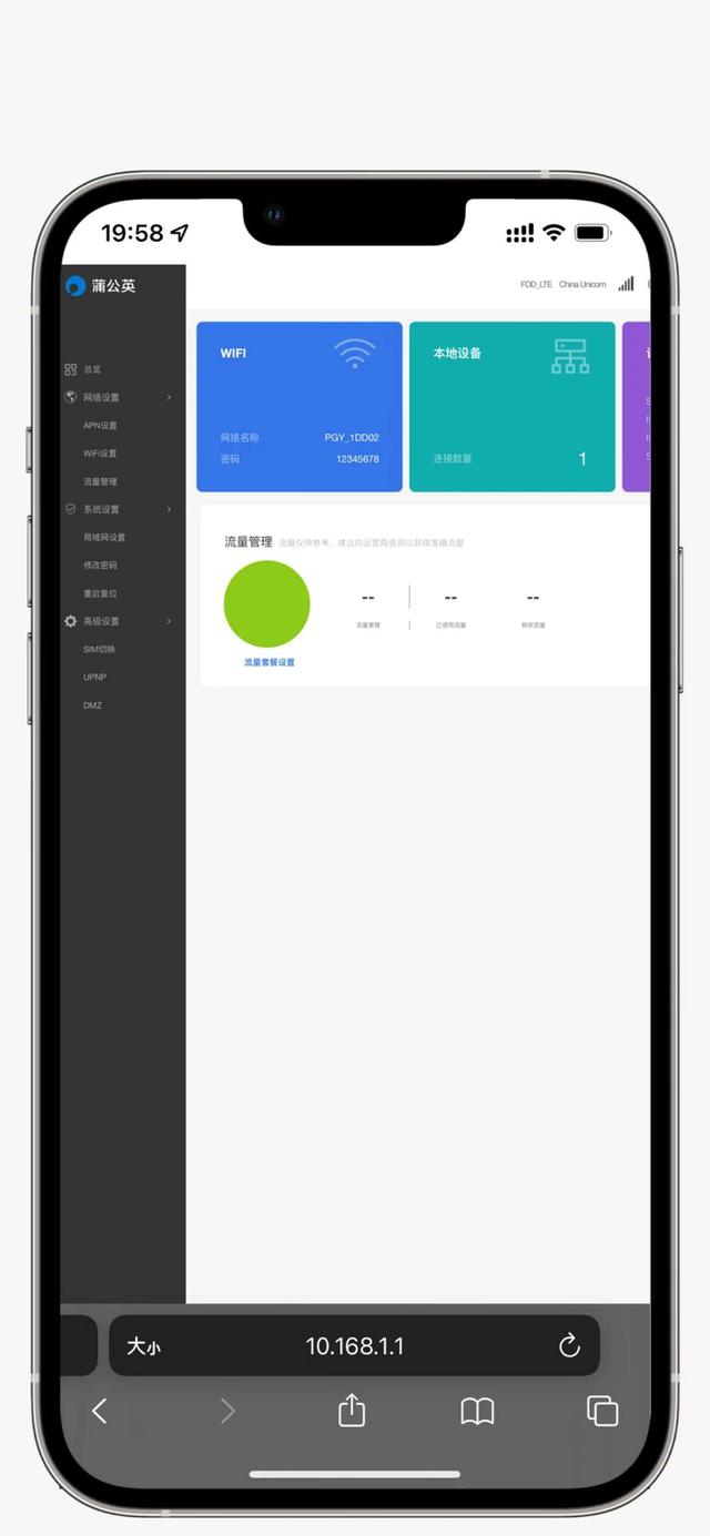 通过了实名认证之后,就可以连接到蒲公英X4U随身WiFi的网络了,输入机身背后的管理网址10.168.1.1,就能够打开管理后台。不过蒲公英似乎没有为这个管理后台设计手机端适配,所以建议还是用笔记本来操作比较方便、直观。