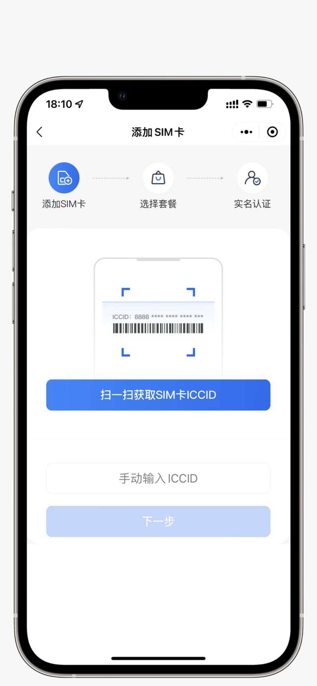 点击“添加SIM卡”之后,再点一下“扫一扫获取SIM卡ICCID”,然后扫描蒲公英X4U随身WiFi背面的ICCID条形码,即可进行绑定。