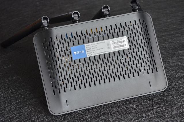 路由器的背板均匀分布了椭圆形的散热孔,两端的弧形设计,有助于空气流通更有利于机身散热。中间位置有一张标签,上面有路由器的管理地址,还有登陆的用户名和密码。